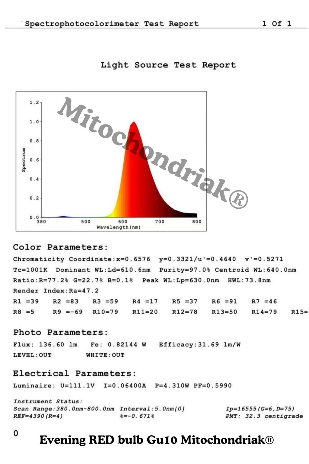 Naša červená GU10 žiarovka Mitochondriak® neobsahuje žiadne modré ani zelené svetlo a nemá flicker (tzv. zero flicker).