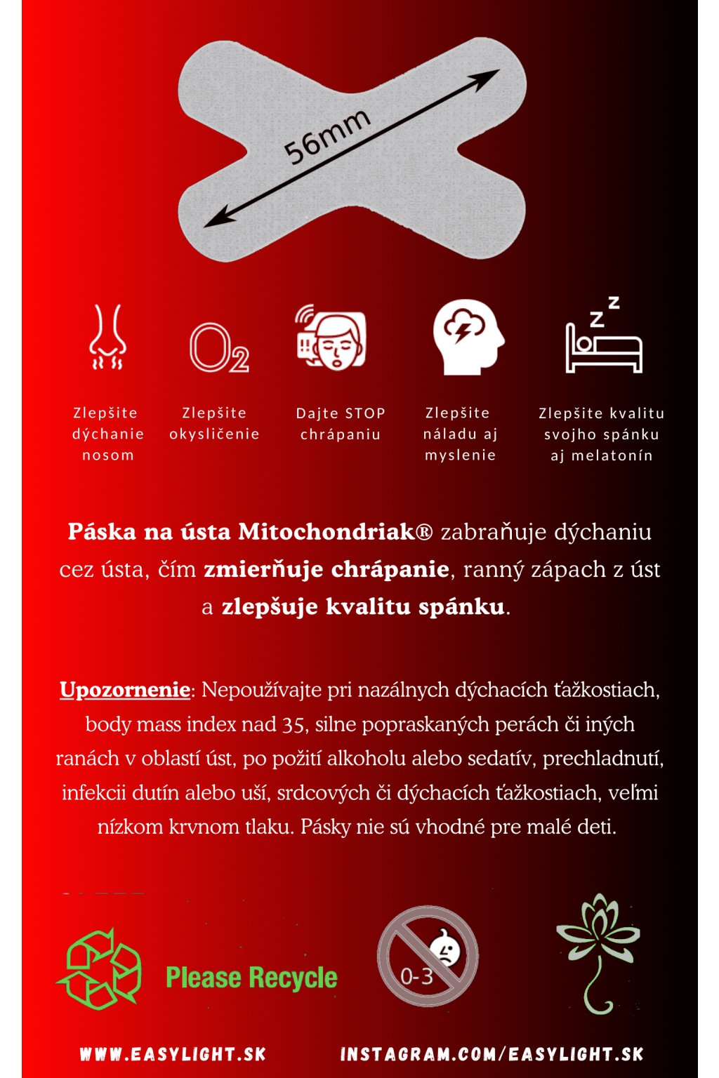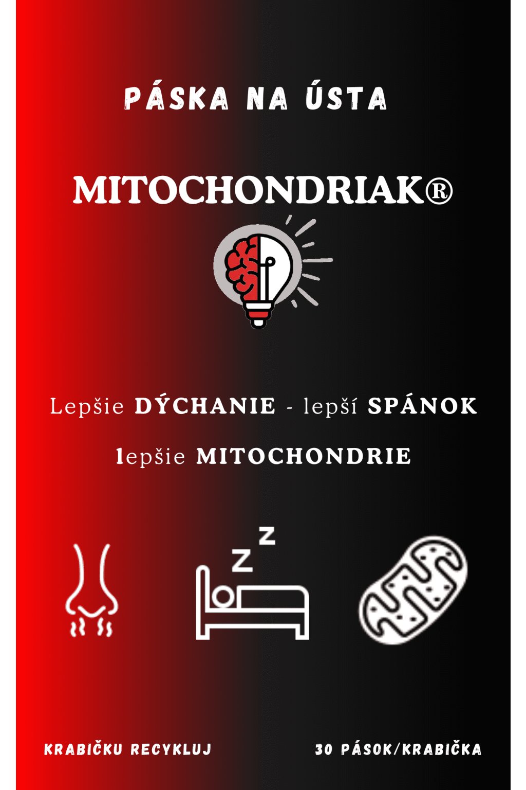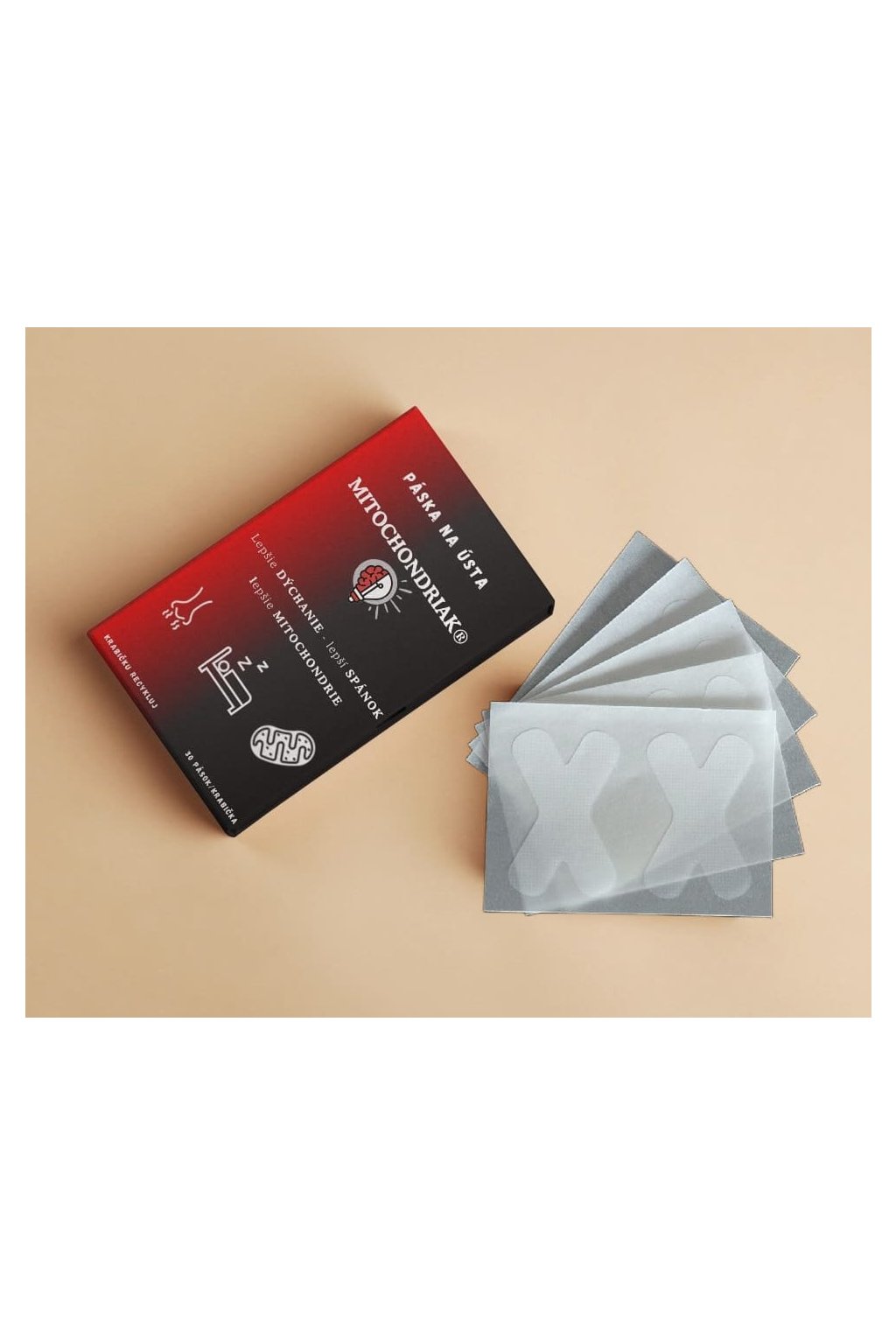 Pásky na ústa Mitochondriak® zabraňujú dýchaniu cez ústa, čím zmierňujú chrápanie, ranný zápach z úst, ale hlavne zvyšujú Vaše okysličenie, hladinu oxidu dusnatého aj melatonínu, čím zlepšujú kvalitu spánku.